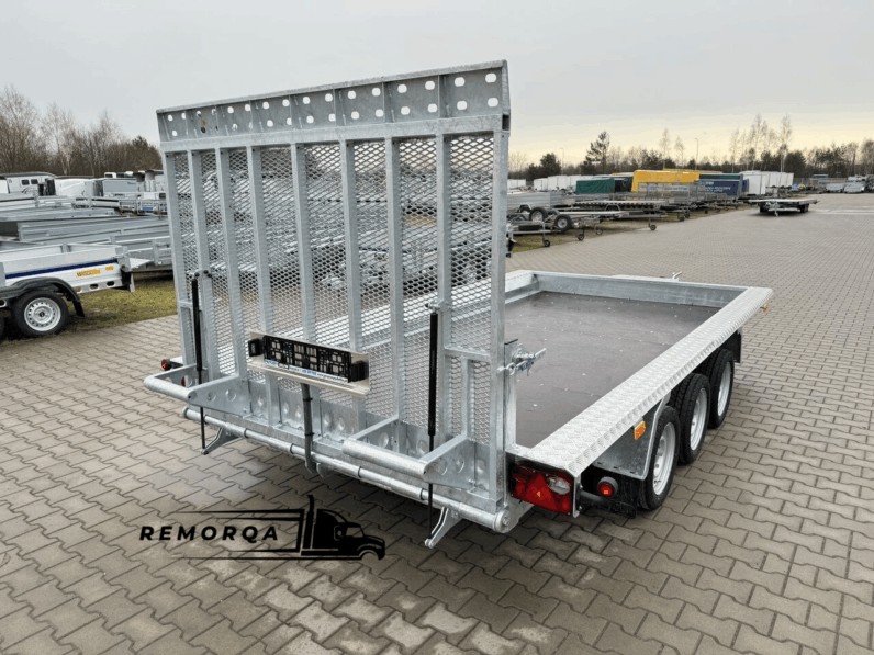Le plancher est recouvert de contreplaqué antidérapant imperméable de 15 mm d'épaisseur, tandis que les parois latérales sont en tôle d'aluminium-zinc hautement emboutie. La remorque est équipée d'un support pour godet d'excavatrice, de garde-boue en acier avec marchepied facilitant l'accès à l'opérateur et d'une capacité de charge allant jusqu'à 150 kg. La rampe d'accès arrière est soutenue par des vérins à gaz et des supports intégrés sécurisent la remorque. La remorque est équipée de 3 essieux freinés d'une capacité de charge totale de 4 050 kg.