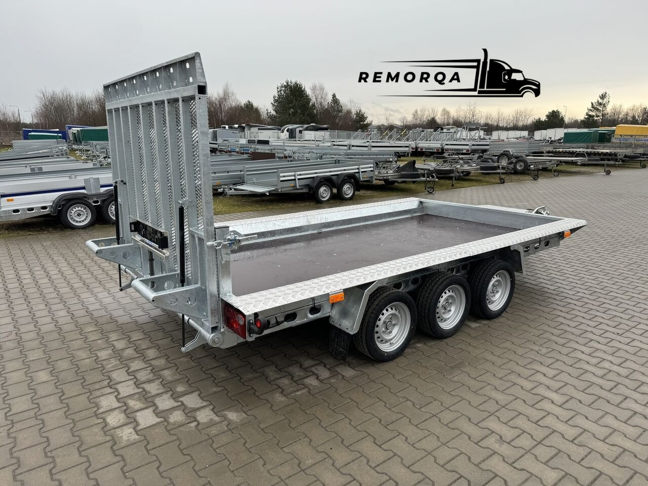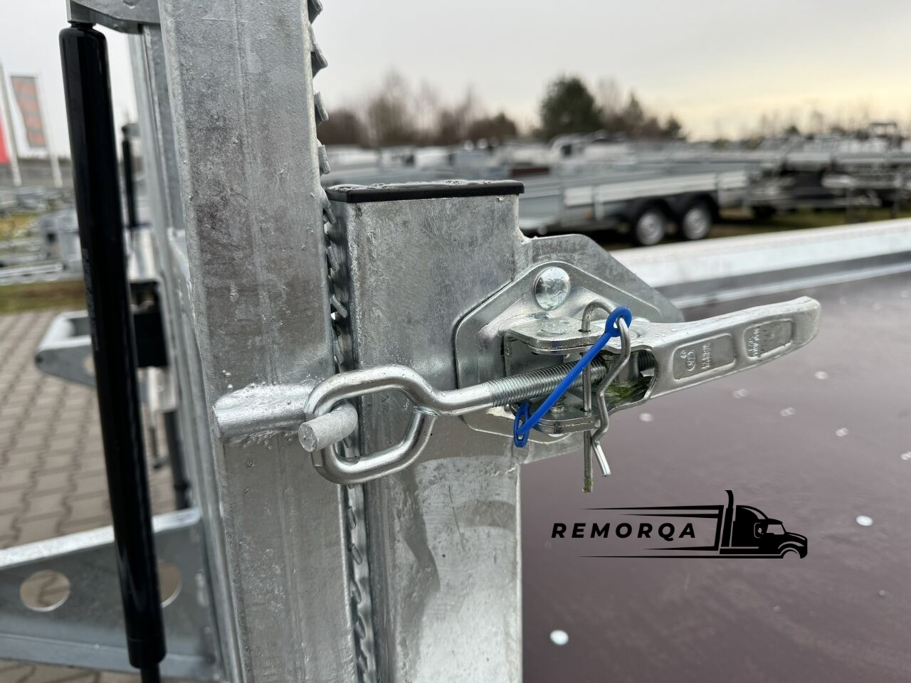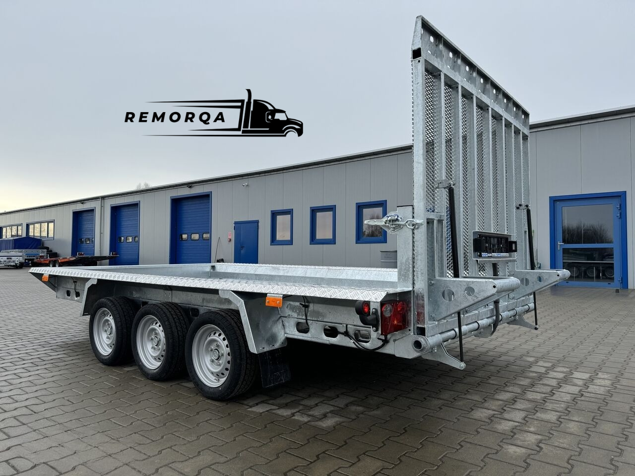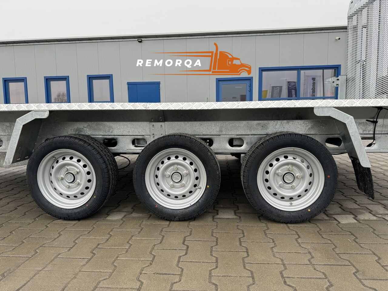 Le plancher est recouvert de contreplaqué antidérapant imperméable de 15 mm d'épaisseur, tandis que les parois latérales sont en tôle d'aluminium-zinc hautement emboutie. La remorque est équipée d'un support pour godet d'excavatrice, de garde-boue en acier avec marchepied facilitant l'accès à l'opérateur et d'une capacité de charge allant jusqu'à 150 kg. La rampe d'accès arrière est soutenue par des vérins à gaz et des supports intégrés sécurisent la remorque. La remorque est équipée de 3 essieux freinés d'une capacité de charge totale de 4 050 kg.