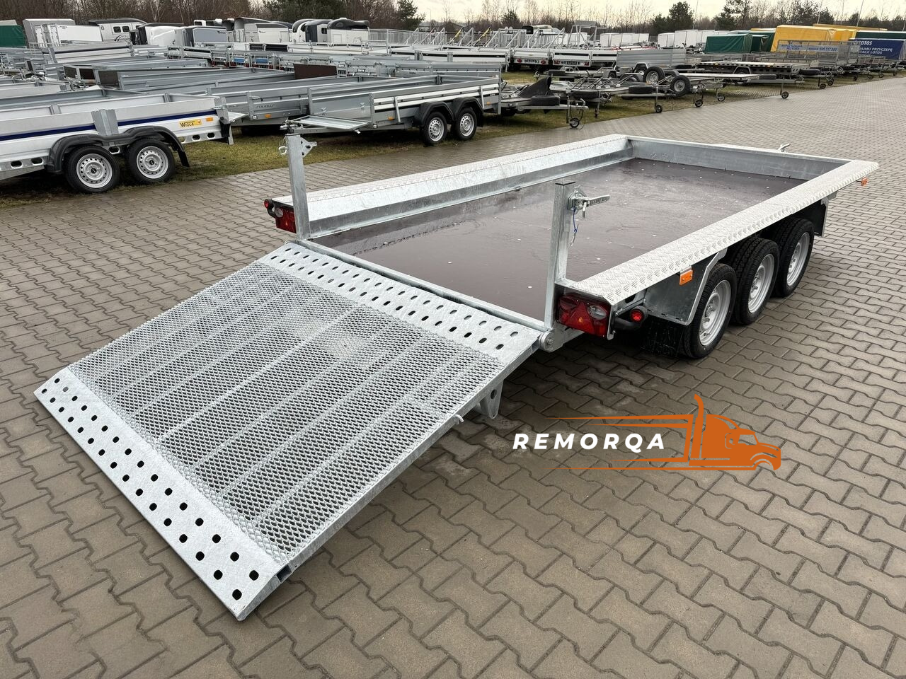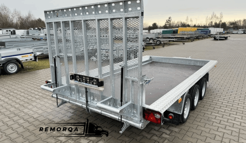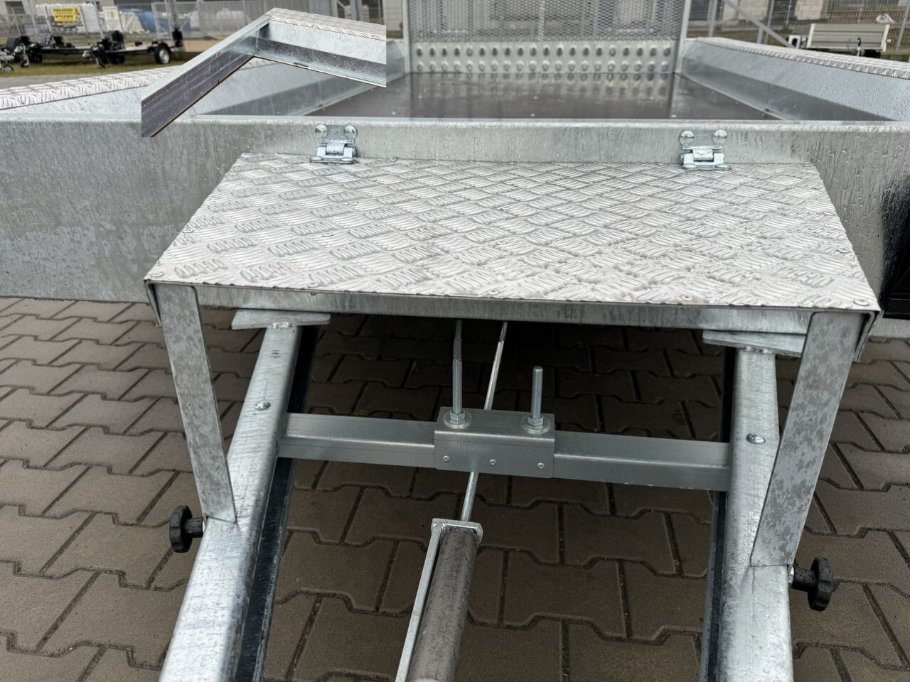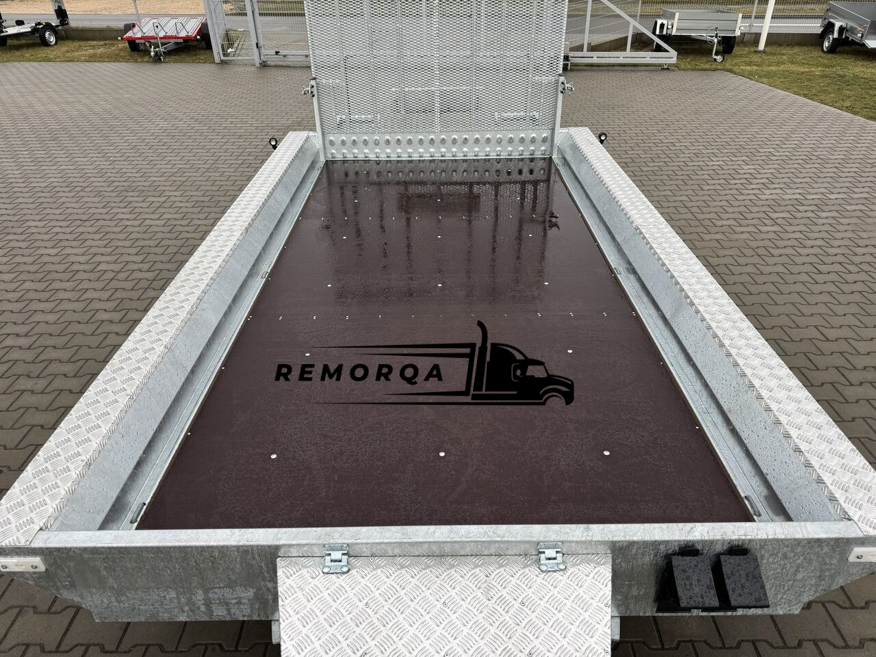 Le plancher est recouvert de contreplaqué antidérapant imperméable de 15 mm d'épaisseur, tandis que les parois latérales sont en tôle d'aluminium-zinc hautement emboutie. La remorque est équipée d'un support pour godet d'excavatrice, de garde-boue en acier avec marchepied facilitant l'accès à l'opérateur et d'une capacité de charge allant jusqu'à 150 kg. La rampe d'accès arrière est soutenue par des vérins à gaz et des supports intégrés sécurisent la remorque. La remorque est équipée de 3 essieux freinés d'une capacité de charge totale de 4 050 kg.