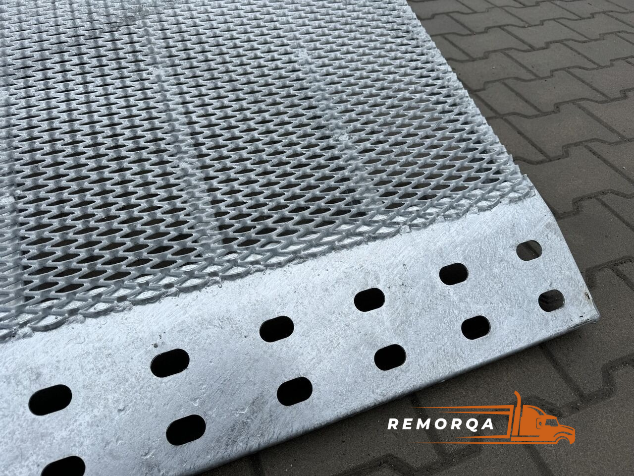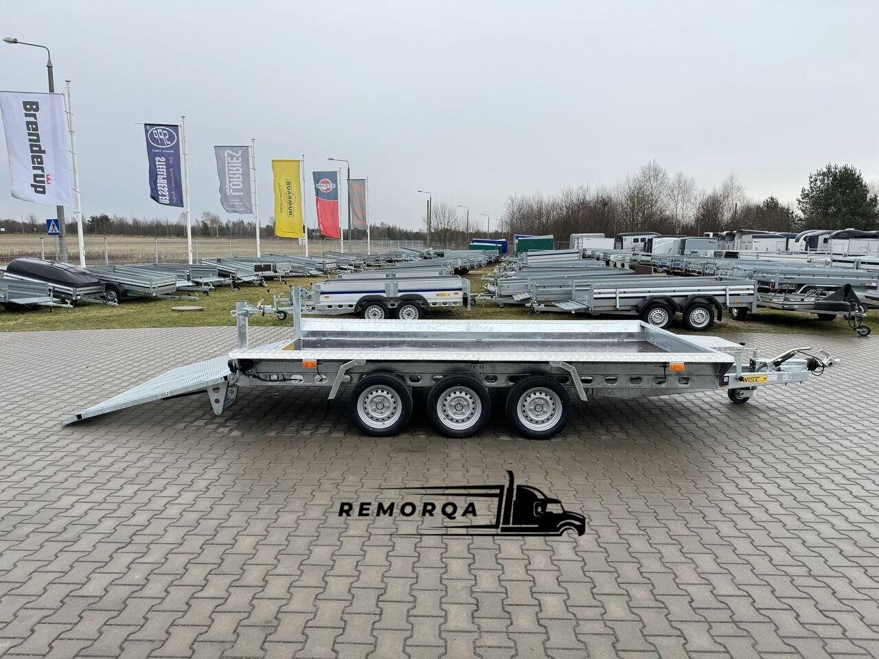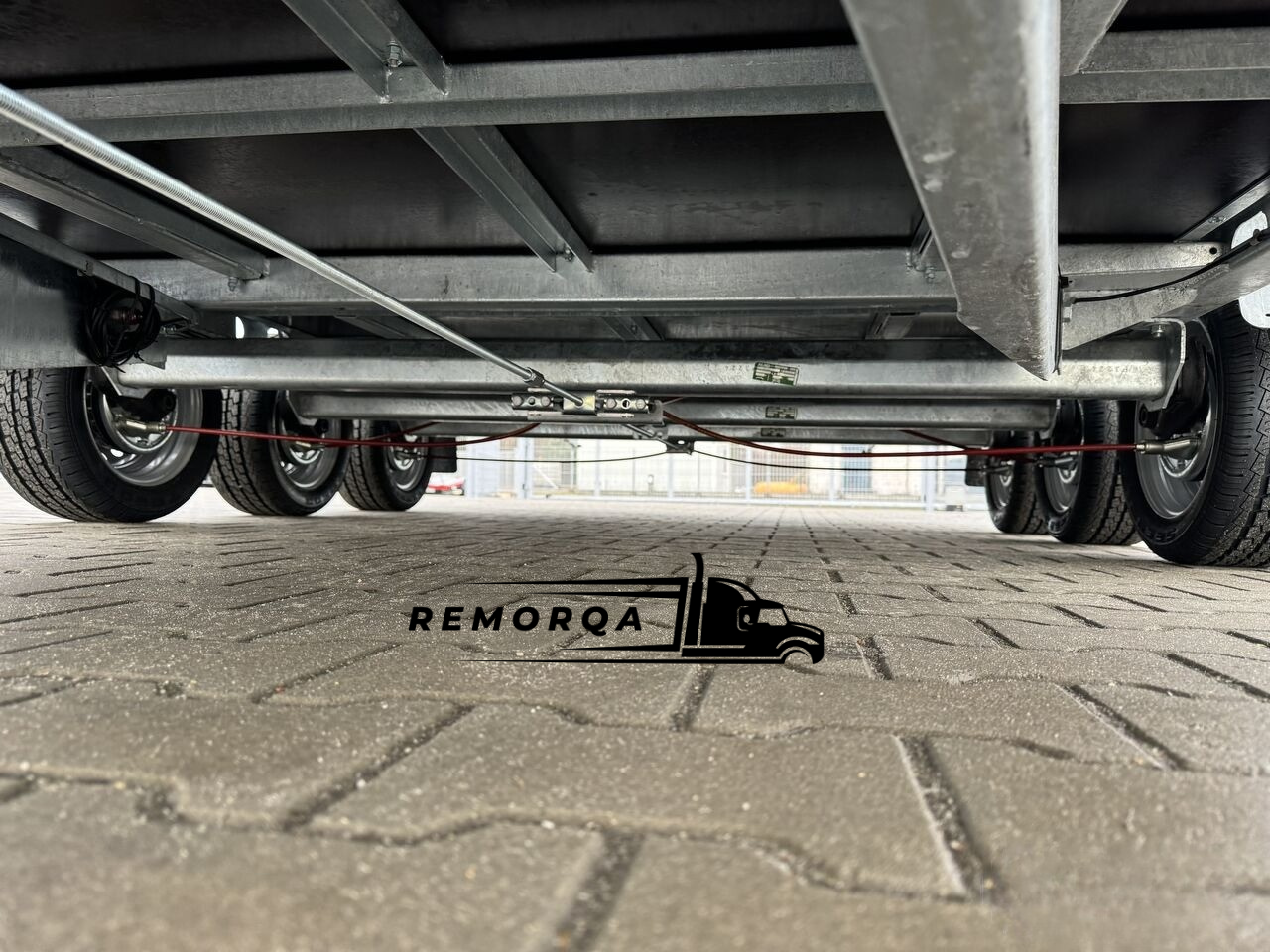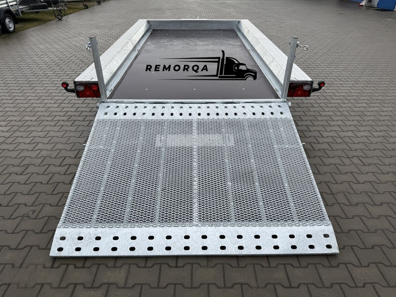 Le plancher est recouvert de contreplaqué antidérapant imperméable de 15 mm d'épaisseur, tandis que les parois latérales sont en tôle d'aluminium-zinc hautement emboutie. La remorque est équipée d'un support pour godet d'excavatrice, de garde-boue en acier avec marchepied facilitant l'accès à l'opérateur et d'une capacité de charge allant jusqu'à 150 kg. La rampe d'accès arrière est soutenue par des vérins à gaz et des supports intégrés sécurisent la remorque. La remorque est équipée de 3 essieux freinés d'une capacité de charge totale de 4 050 kg.